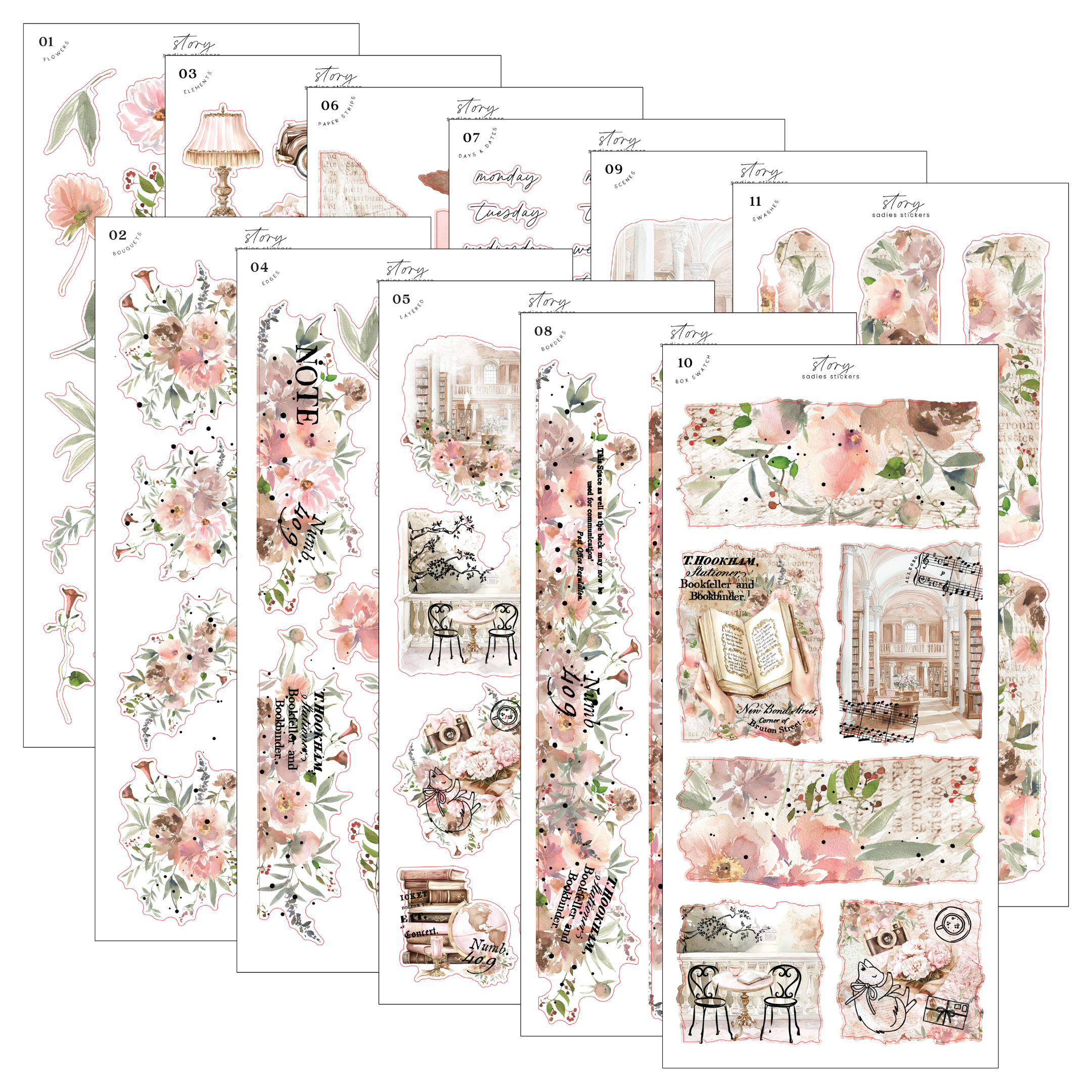 Sheets 2, 4, 5, 8, and 10 are foiled in rose gold.