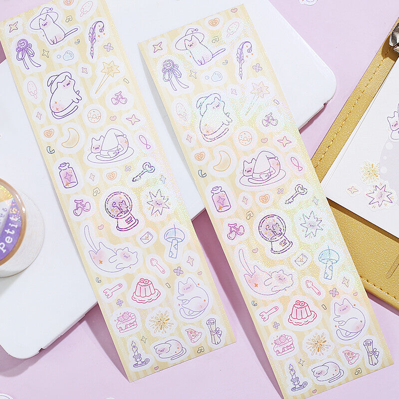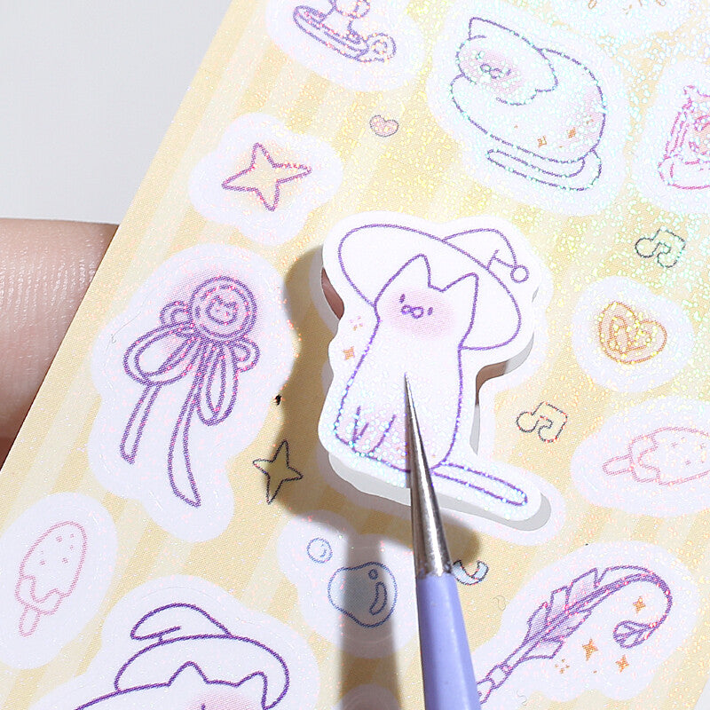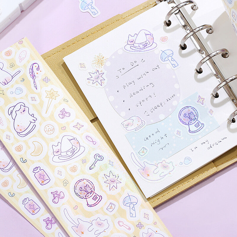Stickers on a roll! Individual die-cut stickers rolled onto a clear backing. Super sparkly finish with glittery holographic lamination.