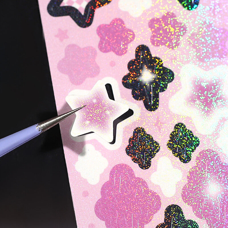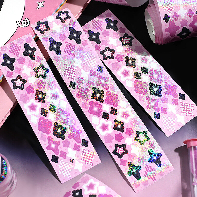 Stickers on a roll! Individual die-cut stickers rolled onto a clear backing. Super sparkly finish with glittery holographic lamination.