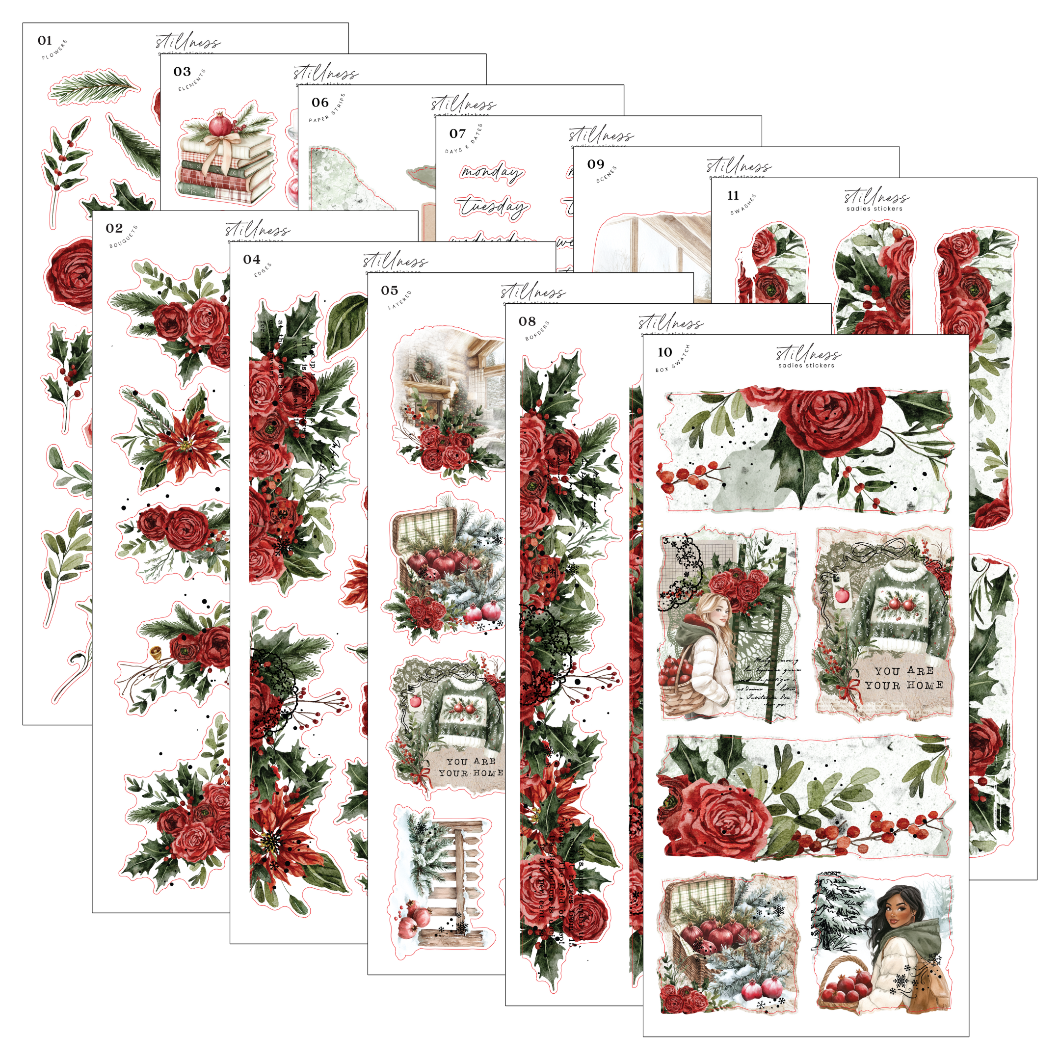 Sheets 2, 4, 5, 8, and 10 are foiled in rose gold.