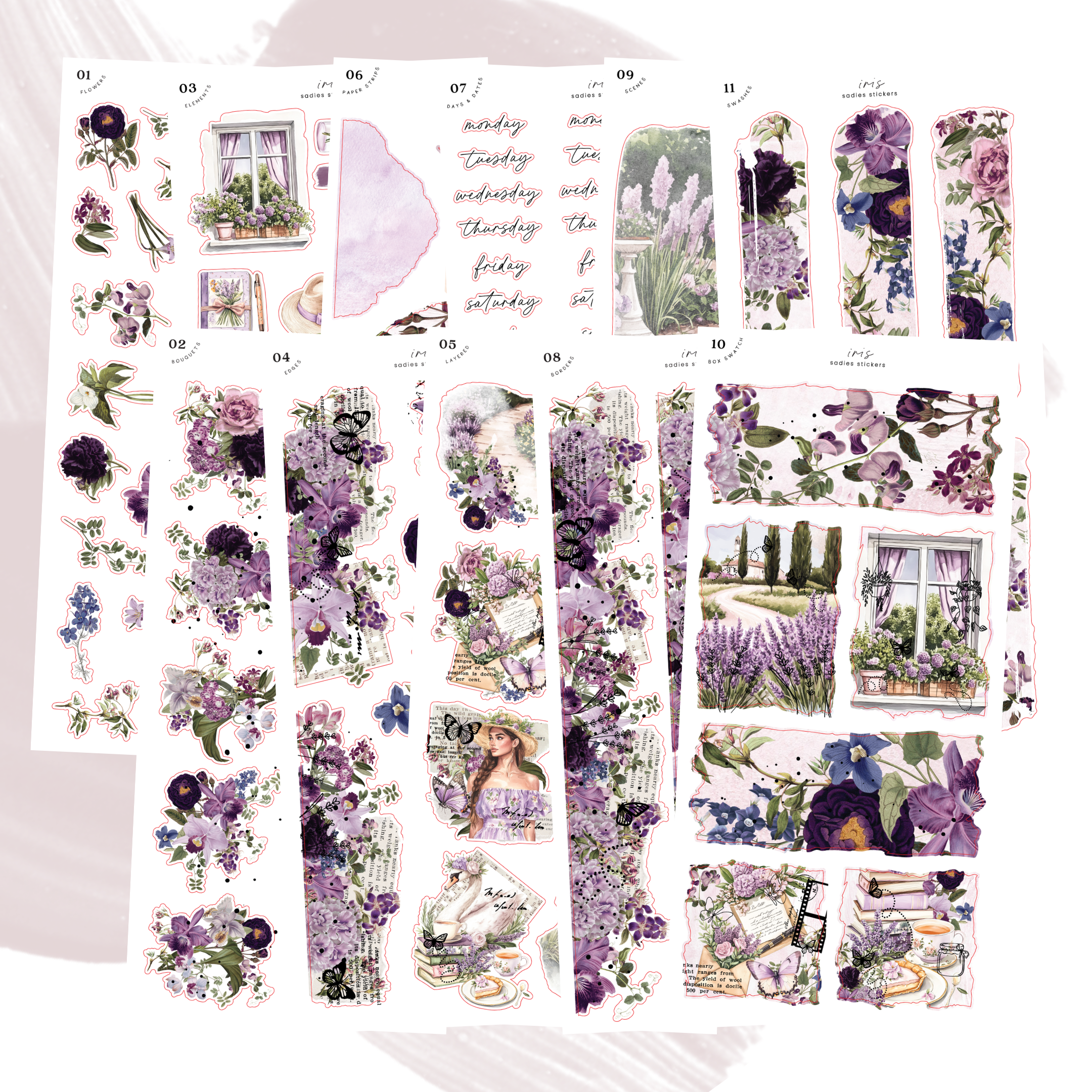 Sheets 2, 4, 5, 8, and 10 are foiled in rose gold.