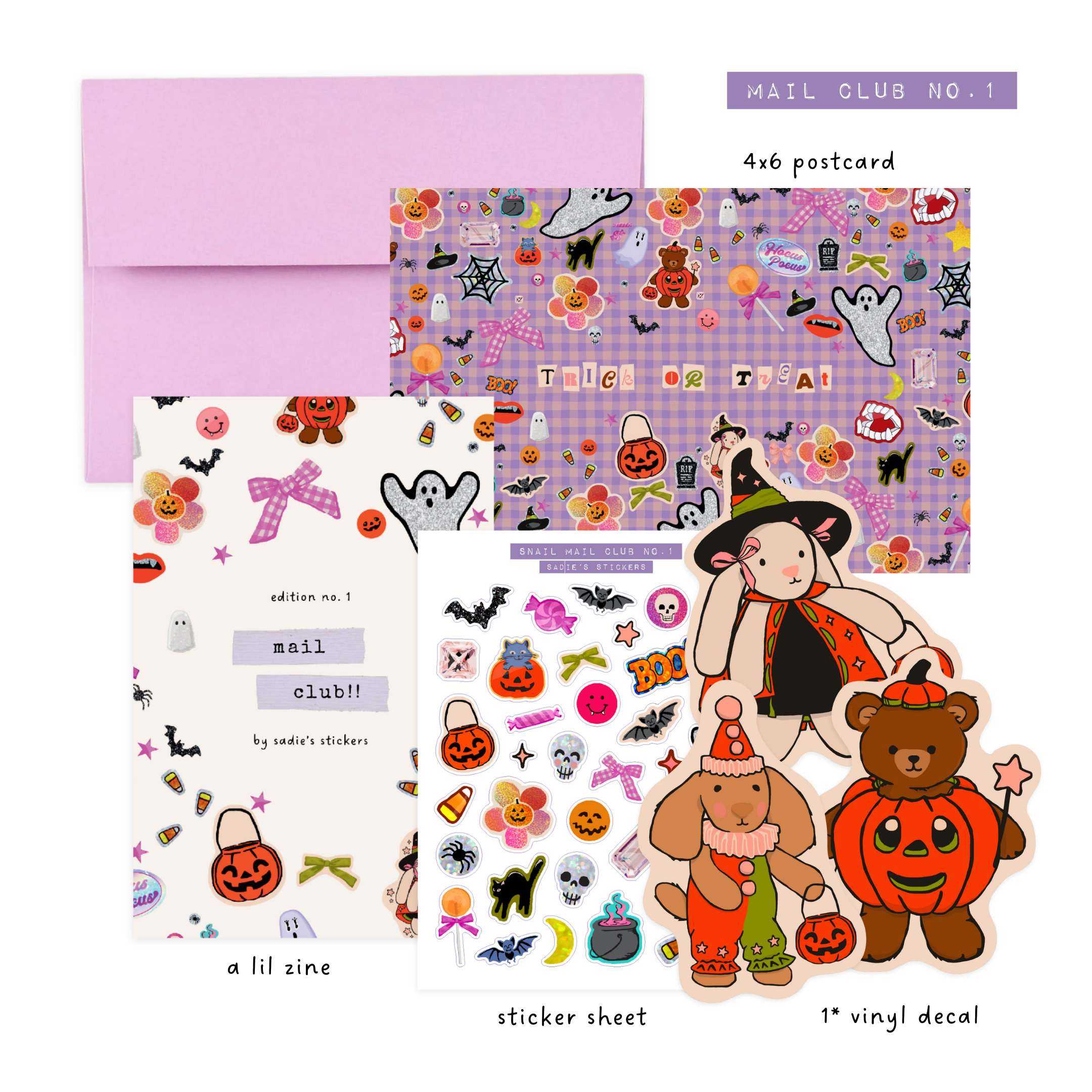 It wouldn't be a Sadie's Stickers club without stickers; of course you can expect a sheet of stickers and a waterproof vinyl decal. Included additionally is a 4x6 postcard, so you can send some snail mail yourself … or put it in your journal, we won't judge! Finally, you will receive a letter / "zine". Within you may find a little activity, journal prompts, a letter from me – really anything :-)